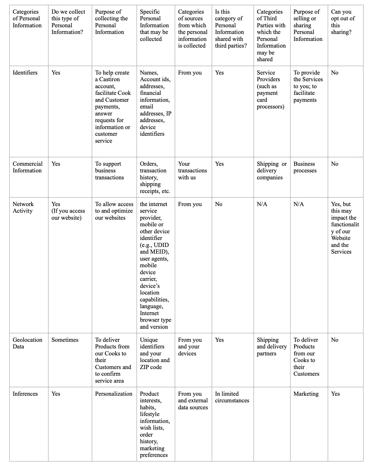 The following chart describes our collection and disclosure practices regarding our Cooks and Customers for the past 12 months: