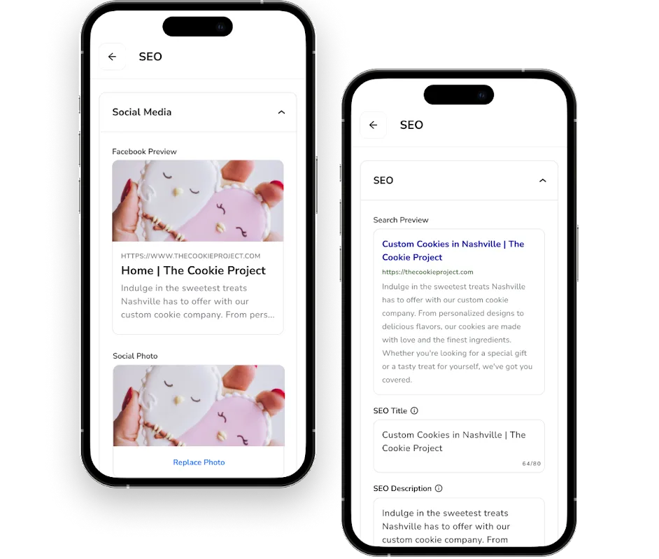 We know how important it is for you to show up for potential customers when they’re looking for a cake, charcuterie board, or other special treat. That’s why we’ve made SEO customizations super simple, yet effective.